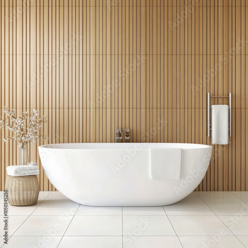Modern bathroom with sleek wooden wall panels and contemporary fixtures