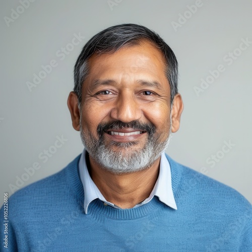 Delighted Indian man in his 60s with short black hair wearing a blue sweater and smiling