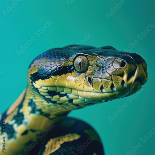 Captivating close-up portrait of an anaconda featuring vivid scales and an intense gaze in a professional studio setup