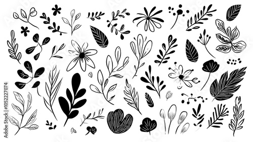 Hand-drawn botanical doodle background with a variety of flowers and leaves