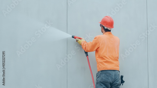 Construction worker cleaning building facade with high pressure hose