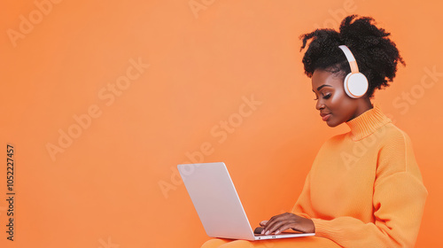 Young woman working remotely with headset at computer desk in modern office, showcasing remote work technology and professional communication