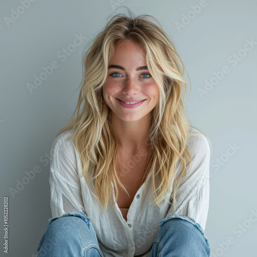 Portrait of a smiling young blonde woman in casual white shirt and jeans, exuding confidence and warmth.