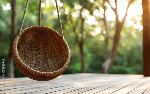 A rustic hanging basket rests serenely on a wooden deck, surrounded by soft sunlight filtering through lush greenery. #1052869942