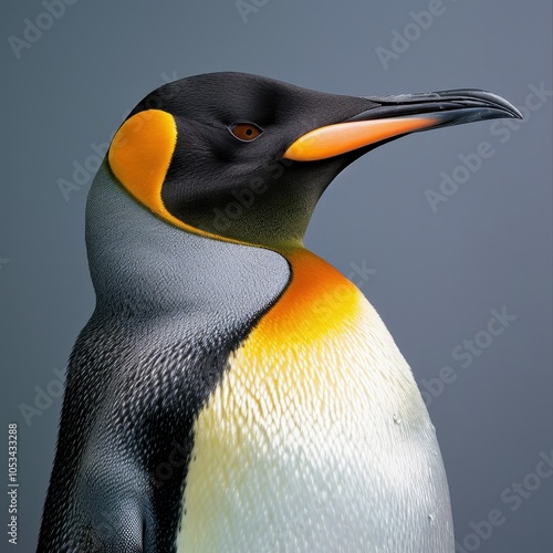 Elegant portrait of a king penguin showcasing its vibrant plumage in a professional studio setting, highlighting its majestic features and graceful presence.