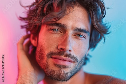 Striking Mediterranean man in neon colors, modern skin care and beauty concept