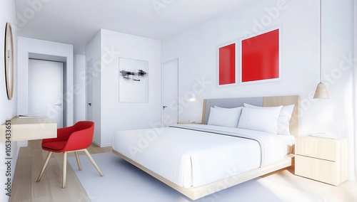 Bright minimalist youth dorm room with typical decoration and furniture as digital illustration (Generative AI)