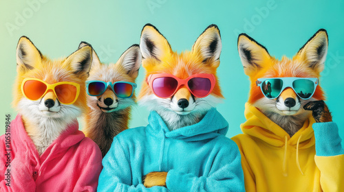Trendy anthropomorphic fox group wearing vibrant hoodies and sunglasses