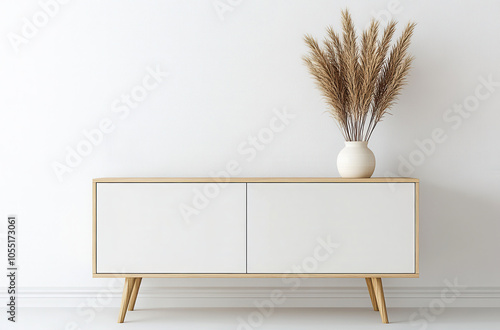 Elegant white sideboard with decorative vase against minimalist wall
