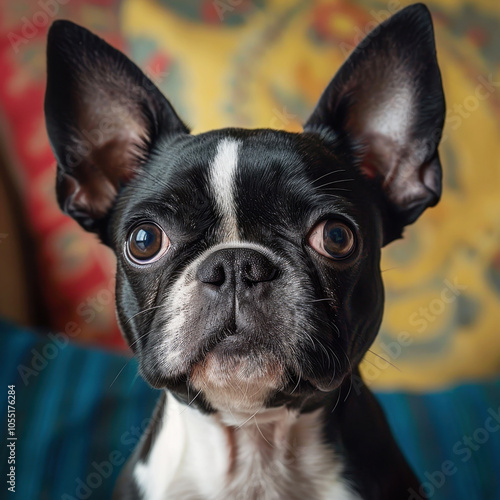 Close-up portrait of an attentive Boston Terrier against a colorful blurred background, showcasing its alert expression and distinctive features.