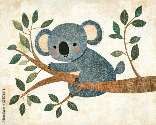 Charming folk art illustration of a cute koala resting on a branch in a storybook style art piece
