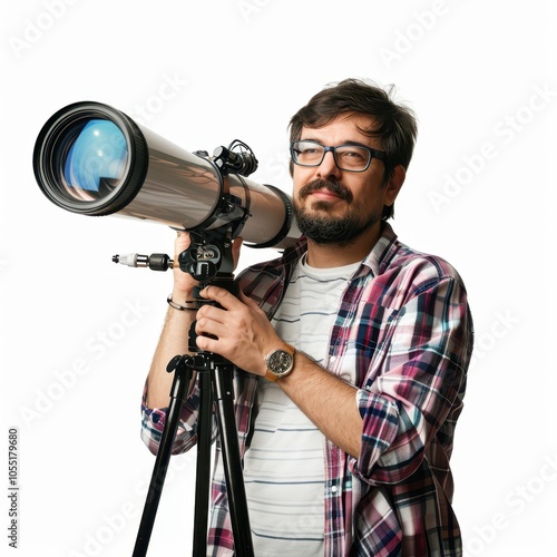 Enthusiastic male astronomer gazing through a telescope isolated on white