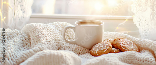 Cozy winter scene featuring a mug of hot cocoa and gingerbread cookies