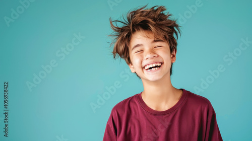 Casual Asian teen with spiky brown hair posing in front of blue background