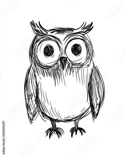 Minimalistic stick figure drawing of an owl in black ink with simple, cute features and large eyes
