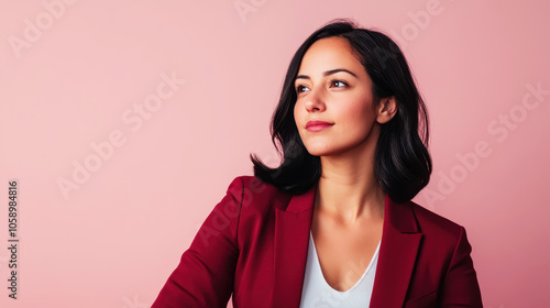 Confident Colombian businesswoman in a red suit with thoughtful expression