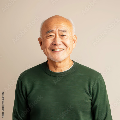 Portrait of a smiling Asian senior man with grey hair wearing a green sweater