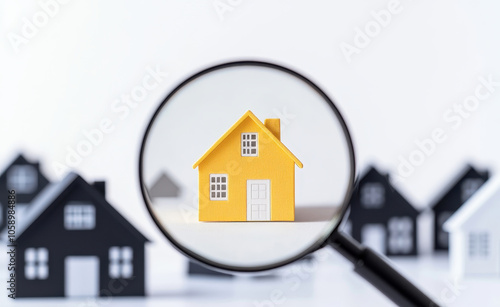 Close-up of a hand holding a red house icon surrounded by smaller houses