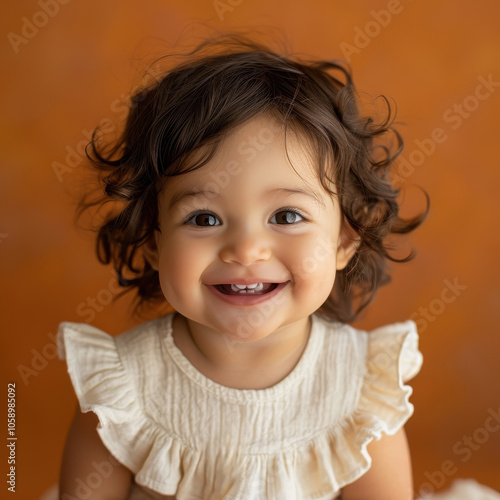 Adorable Hispanic baby girl with a joyful smile against a yellow background