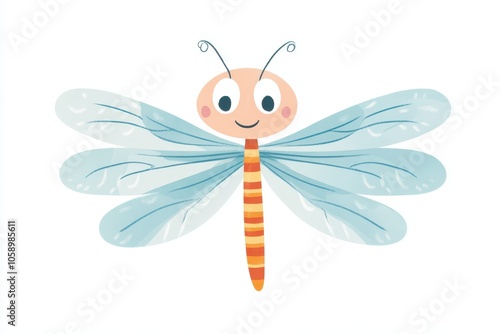 Charming cartoon dragonfly with a smile, featuring vibrant colors and playful design, ideal for children's books and educational materials