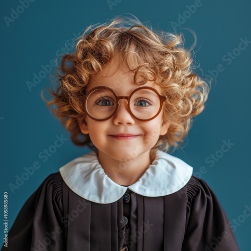 Adorable child with curly hair dressed up as a judge in a costume with a playful expression