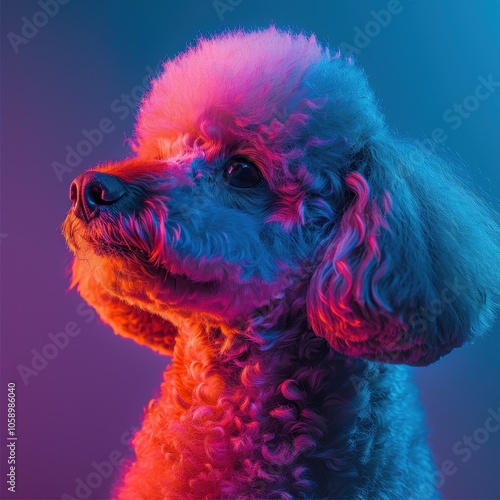 Colorful poodle dog portrait in studio lighting showcasing vibrant hues and fluffy texture of fur in an artistic manner