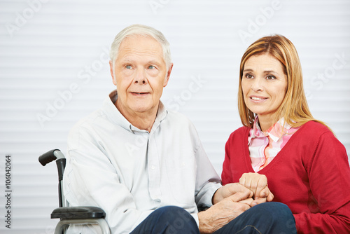 Lächelnde Frau umarmt Senior im Seniorenheim
