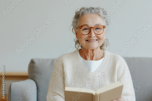 Smiling elderly woman with glasses reading on a comfortable sofa