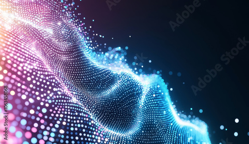 Abstract blue and pink wave with glowing particles on dark background