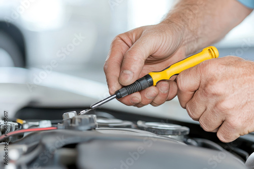 Mechanic repairing a damaged red car in auto workshop, focusing on detail work with hands-on craftsmanship in vehicle repair.