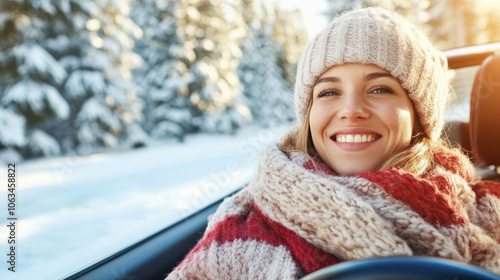 Smiling woman enjoys scenic winter car journey through snowy forest