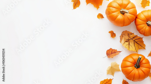 Autumn pumpkins and leaves border on a white background