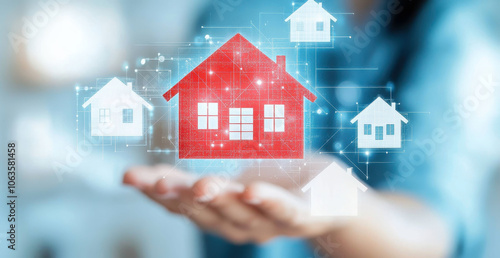 Close-up of a hand holding a red house icon surrounded by smaller houses