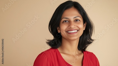A smiling Indian woman in her 30s with medium-length black hair wearing a red shirt against a beige background