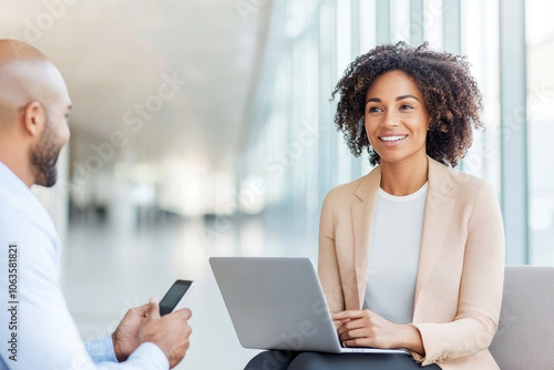 Diverse business team working together, collaboration on project, teamwork in modern office, woman and man looking at laptop screen, business meeting, focus and concentration