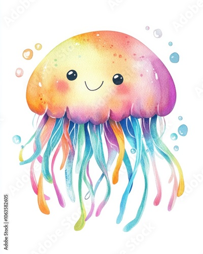 Colorful watercolor cartoon jellyfish with a happy face ideal for nursery and children's artwork