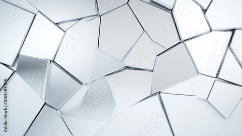 Abstract reflective chrome metallic surfaces create a modern geometric pattern with sharp angular shapes and high contrast lighting