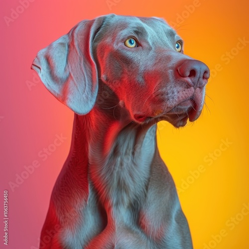 Weimaraner dog portrait in studio with colorful lighting, showcasing elegance and poise under artistic lighting conditions.
