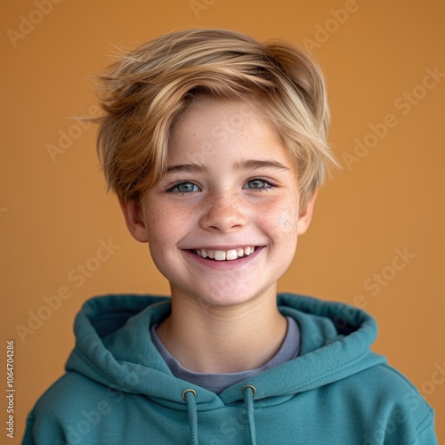 Cheerful Belgian teenager smiling in blue hoodie against orange background