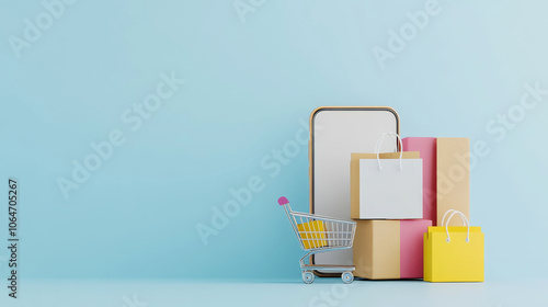 Online shopping concept with colorful bags and smartphone on a pastel background