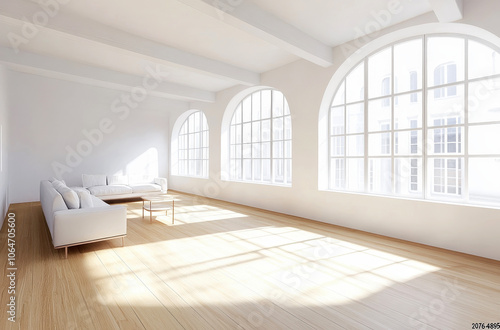 Modern living room interior with large windows overlooking autumn forest, bright sunlight, cozy sofa, minimalist design, nature view, home decor, comfortable space, residential architecture