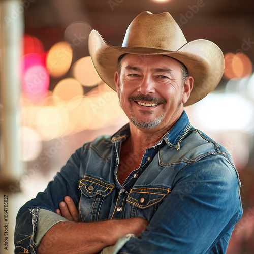 Smiling cowboy with a hat posing for a friendly portrait in casual denim outfit