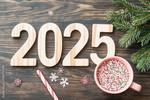Wooden numbers 2025 with candy and hot chocolate for New Year's