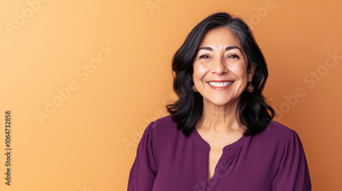 Portrait of a smiling Hispanic woman in her 20s with medium-length hair, wearing a purple shirt against a beige background.