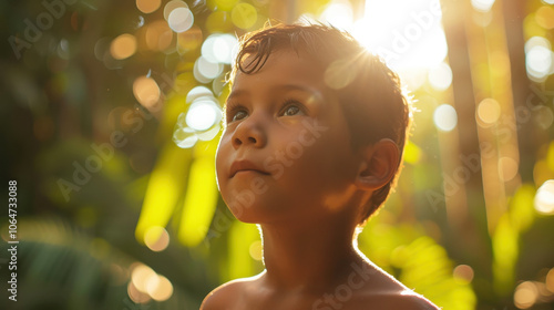 Portrait of a joyful Panamanian boy aged 7 with sunlit background