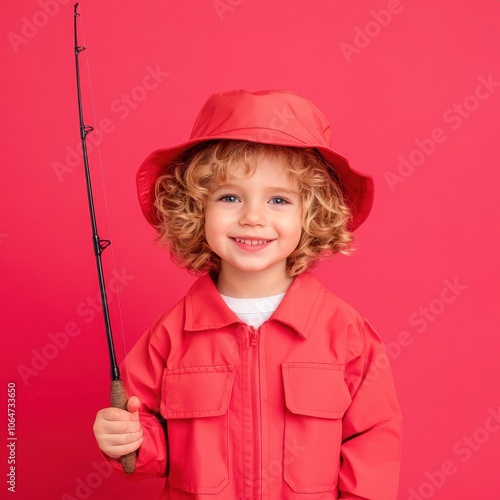 Adorable child playing as a fisherman with a fishing rod on a blue background