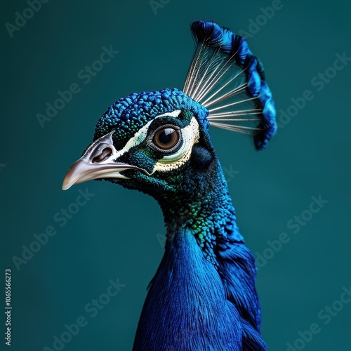 Vibrant portrait of a peacock showcasing its stunning iridescent feathers in a professional studio setting, highlighting the beauty and elegance of this magnificent bird.