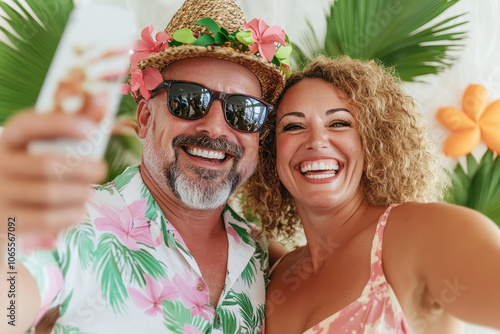 Happy couple taking a tropical beach selfie during Christmas vacation