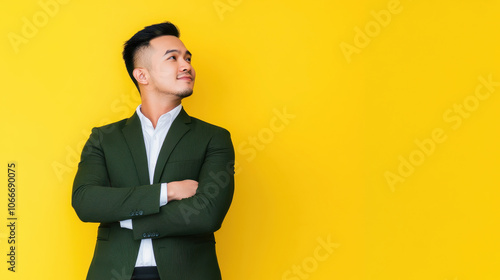Confident Malaysian businessman in a suit against a yellow background