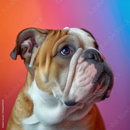 Portrait of a charming bulldog captured in a studio with a vibrant gradient background showcasing its expressive features and regal demeanor